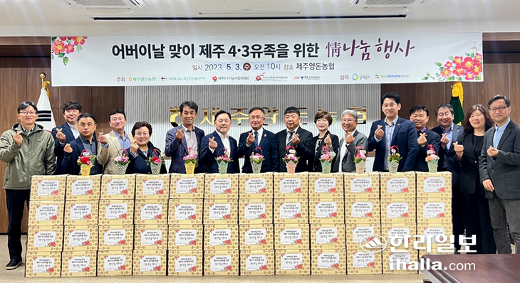 제주양돈농협(조합장 고권진)과 (사)나눔축산운동본부는 지난 3일 농협 본점 2층 대회의실에서 '어버이날 맞이 제주4·3 유족을 위한 '情 나눔행사'를 진행했다. 이날 제주4·3유족회에 450만원 상당의 돼지고기를 전달하고, 평화와 인권의 가치를 알리기 위해 제주4·3기념사업위원회에 후원금 500만원을 기탁했다. 양돈농협은 4·3 유족을 위한 정 나눔행사를 4·3 70주년 이후 올해까지 지속적으로 이어오고 있다.