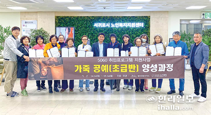 서귀포시니어클럽(관장 박재천)은 지난 4일 서귀포시노인복지지원센터 노인취업교육센터에서 5060 취업프로그램 지원사업인 '가죽공예(초급반) 과정' 수료식을 개최했다. 제주도가 지원한 이 사업은 가죽공예 작업 과정을 체계적으로 알려주고 가죽을 활용한 제품 생산·판매를 통한 일자리를 마련하기 위한 목적으로 마련됐다. 만 60세 이상의 취업 희망자 15명이 지난 4월 4일부터 5월 4일까지 매주 화·목 2시간씩 교육을 받았다.