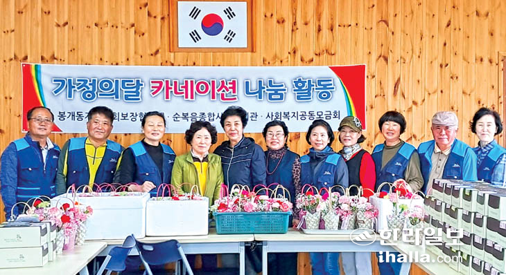 봉개동지역사회보장협의체(공동위원장 김정득, 봉개동장 김문규)는 지난 6일 어버이날을 맞아 관내 장수 어르신 70가구를 방문해 카네이션과 롤케이크를 전달하는 나눔 활동을 추진했다.