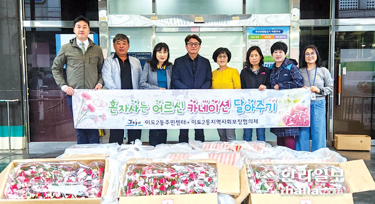제주시 이도2동 지역사회보장협의체(위원장 고향심)는 지난 4일 제51회 어버이날을 맞이해 카네이션 미니 꽃바구니를 직접 만들어 관내 홀로사는 어르신 380가구를 방문해 전달했다.