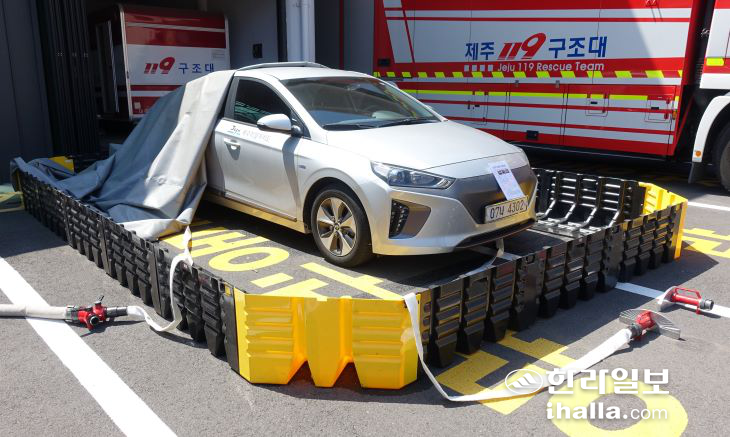 이와 함께 전기차 화재 진압을 위해 제주 전 지역 소방서에 보급된 전기차 화재진압용 이동식 수조와 질식 소화포 등도 전시돼 눈길을 끌었다.