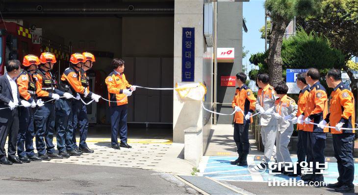9일 제주소방서서에 열린 현장대응단 출범식 참석자들이 현판 제막식을 진행하고 있다. 김도영기자