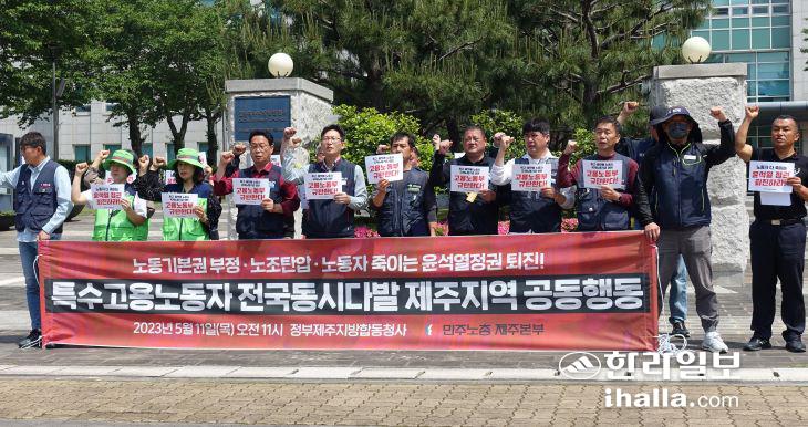 [한라일보] 특수고용 노동자 전국동시다발 제주지역 공동행동(이하 공동행동)은 11일 정부제주지방종합청사 앞에서 기자회견을 열고 "노동기본권을 부정하고 노조를 탄압하며 노동자를 죽이는 윤석열 정권은 퇴진하라"고 말했다.