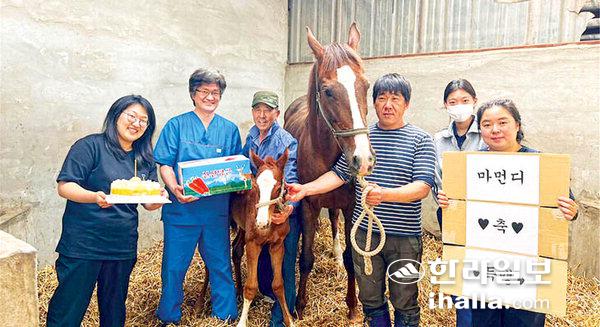 제주대학교 말전문동물병원(병원장 정효훈)은 지난 4일 제주시 월평동 아침해목장(대표 강춘기)에서 7세 더러브렛마 '마먼디'(별명)와 갓 태어난 망아지를 위한 잔치를 열었다고 11일 밝혔다. 마먼디가 세 번의 개복 수술을 겪고도 건강하게 출산한 것을 축하하기 위해 병원 측이 마련한 자리다.