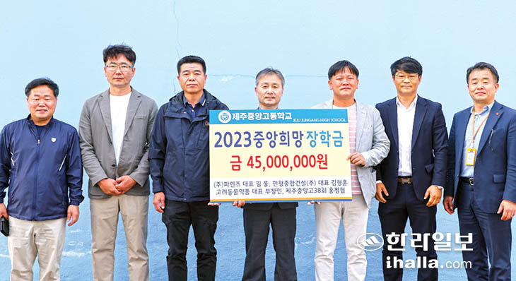 제주중앙고등학교(교장 오재호)는 지난 11일 제54회 다혼디 체육한마당 개회식에서 졸업생 4명(김웅, 김형훈, 부창민, 홍정협)으로부터 '중앙희망 장학금' 4500만원을 기부받았다.