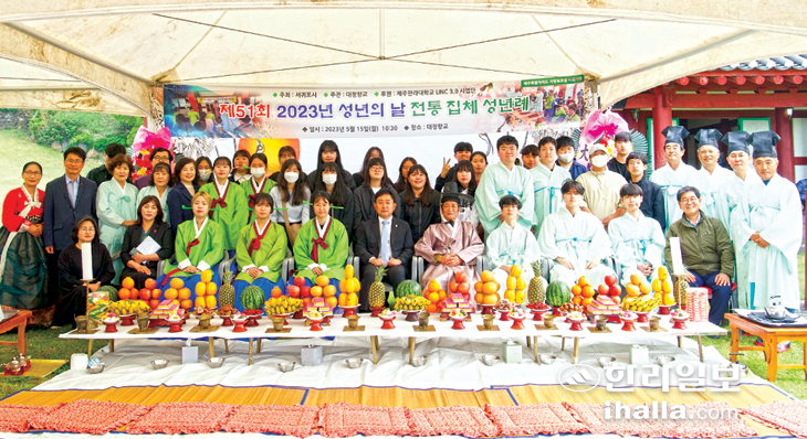 서귀포시는 성년의 날을 맞아 15일 대정향교(전교 이자신)에서 올해 성년을 맞는 청소년(2004년 출생자) 50명과 향교 유림, 지역주민 등 100여명이 참석한 가운데 제51회 성년의 날 기념식 및 전통 성년례를 개최했다.