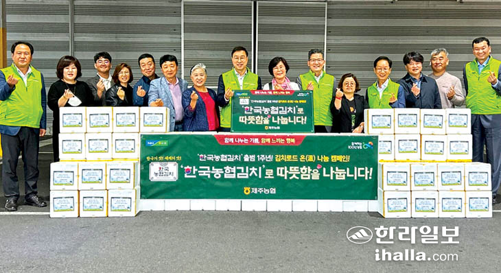 농협제주본부(본부장 윤재춘)는 지난 12일 서귀포농협 유통사업본부에서 위성곤 국회의원(서귀포시), 서귀포시 관내 사회복지시설 관계자 등 20여명이 참석한 가운데 '사랑의 김치 나눔행사'를 진행, 한국농협김치 소포장 6종 세트(4.4㎏) 300세트를 도내 복지시설 31곳에 전달했다. 이번 행사는 한국농협김치 출범 1주년을 기념해 김치로드 온(溫)나눔 캠페인의 일환으로 김치 나눔 행사를 통해 소외계층에 따뜻한 정을 나누기 위해 진행됐다.