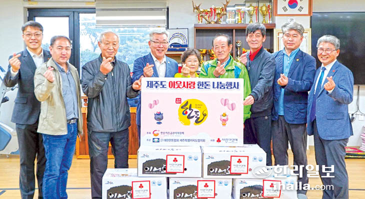 대한한돈협회 제주특별자치도협의회(회장 김재우)는 지난 15일 '제주도 이웃사랑 한돈 나눔행사'를 갖고 해안동경로당을 방문해 한돈 120㎏을 제주사회복지공동모금회(회장 강지언)에 기탁했다. 이날 기탁된 한돈은 지역 내 어려운 노인들을 위해 사용될 예정이다.