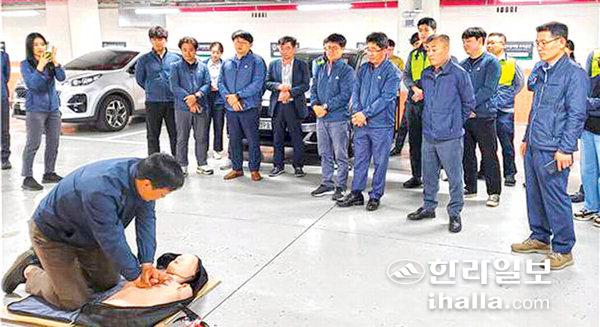 LX 한국국토정보공사 제주지역본부(본부장 이화영)는 지난 16일 제주시 연동 소재 본부 사옥에서 민방위의 날 맞아 대피·구조 훈련을 실시했다. 이번 훈련에는 직원 30여명이 참여해 지하주차장으로 경보에 맞춰 신속하게 대피하고 20분간 국민행동요령 및 생활안전 교육을 진행했다.