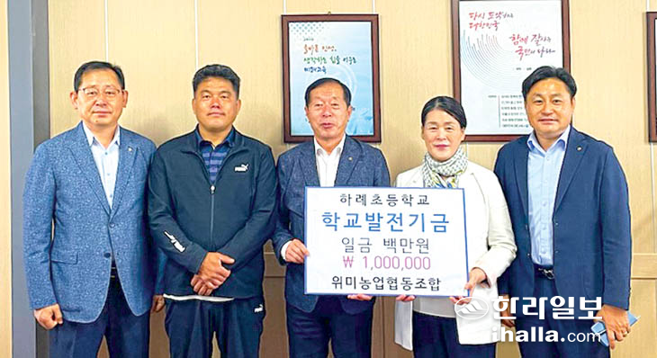 제주위미농협(조합장 현재근)은 지난 12일 관내 학교인 신례초등학교와 하례초등학교를 찾아 학교발전을 위한 발전기금을 각각 100만원을 전달했다.