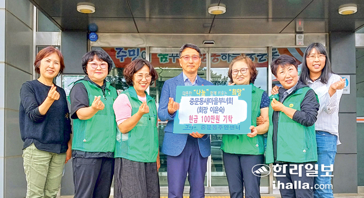 중문동새마을부녀회(회장 이윤숙)는 지난 19일 중문동주민센터를 방문해 지역 내 어려운 이웃을 돕는데 보탬이 됐으면 좋겠다며 이웃돕기 성금 100만원을 기탁했다. 후원금은 지난 달 중문오일시장에서 나눔장터와 알뜰매장을 운영한 판매 수익금으로 마련됐다.