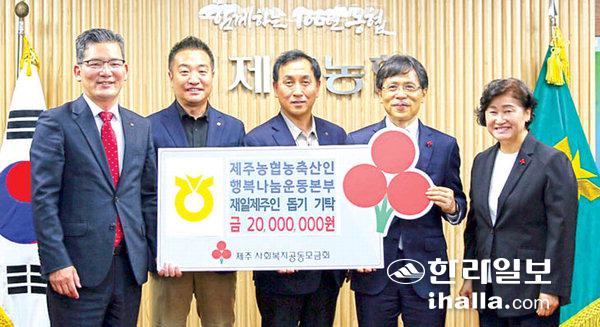 제주농협농축산인행복나눔운동본부(본부장 윤재춘)는 지난 18일 농협중앙회 제주본부에서 NH농협은행 제주본부 고우일 본부장, 농협중앙회 제주본부 고창균 노조위원장이 참석한 가운데 어려운 재일제주인들을 위해 사용해 달라며 성금 2000만원을 기탁했다.