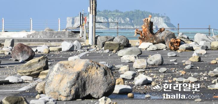 지난해 태풍 힌남노 내습 당시 서귀포시 새연교 주차장이 강한 비바람에 떠밀려온 거대한 바위들로 뒤덮여 있다. 한라일보DB