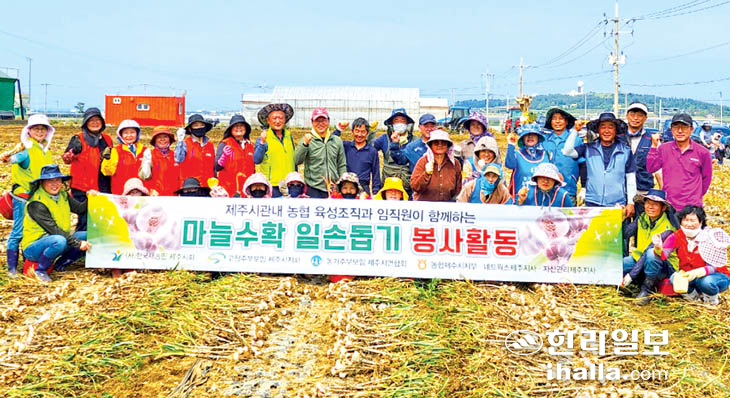 농협제주시지부(지부장 이춘협)는 지난 20일 제주시지부 육성조직(새농민회, 농가주부모임, 고향주부모임)과 계열사, 임직원 등 40여명이 참여해 제주시 한경면 고산리 소재 홀몸 어르신 농가의 밭에서 마늘 수확 일손돕기를 벌였다.