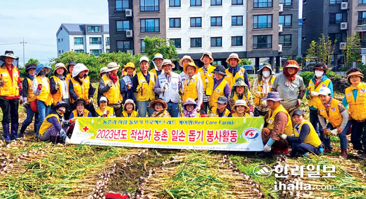 대한적십자사봉사회제주시지구협의회(회장 양진석)는 지난 21일 적십자봉사원 40여명이 참여한 가운데 제주시 애월읍 하귀리의 농가를 방문해 농촌 마늘 수확 일손돕기 봉사활동을 실시했다.