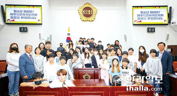 제주특별자치도의회는 24일 본회의장에서 해안초등학교 5~6학년 학생 39명이 참여해 청소년의회 의정체험 모의의회를 개최했다. 이날 청소년 의정체험은 해안초등학교 5학년 26명, 6학년 13명의 학생들이 1일 도의원으로서의 각자 맡은 역할에 따라 직접 심사보고 및 찬반토론, 전자표결, 3분 자유발언 등의 모의의회를 직접 진행했다.