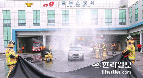 제주동부소방서(서장 황승철)는 지난 19일부터 26일까지 119센터 전 직원을 대상으로 전기자동차 화재진압훈련을 실시하고 있다.