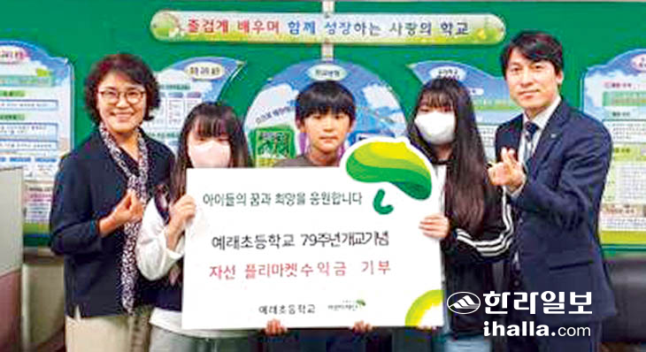 예래초등학교(교장 오순애) 어린이회는 지난 26일 제79주년 개교 기념 플리마켓 수익금을 초록우산어린이재단에 전달했다. 예래초 학생과 교직원들은 해당 수익금을 어려운 아동들을 위해 써 달라고 당부했다.