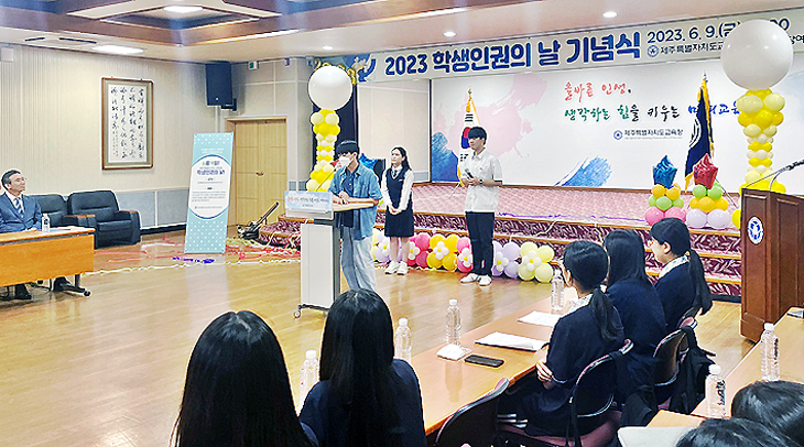 제주도교육청은 지난 9일 교육청 대회의실에서 도교육청 학생인권참여위원회 주관으로 '2023 학생인권의 날 기념식'을 개최했다. 이날 행사에는 학생, 학부모, 교직원이 참석해 '학생인권 영상' 감상, 학생인권 이야기, 학생인권 스피치 대회가 이뤄졌다.