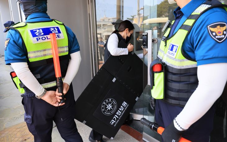 국가정보원과 경찰 관계자들이 14일 오전 제주시 연동 전국학교비정규직노동조합 제주지부에 대해 국가보안법 위반 혐의로 압수수색하고 있다. 연합뉴스