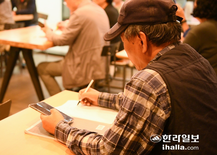 [한라일보] "이렇게 생긴 거 보이시나요. 이게 '플레이스토어'예요. 저희가 물 마시고 싶을 때 슈퍼에서 사잖아요. 무료든 유료든 어플은 여기에서 사는 겁니다." 지난 13일 제주도근로자종합복지관 지하에 있는 '디지털배움터'. 곽도연 강사의 말에 머리가 희끗한 교육생들이 손에 든 스마트폰을 들여다보며 손가락을 움직였다. 듣고 배운 걸 금세 잊을 세라 미리 챙겨온 수첩에 꼬박꼬박 받아 적기도 했다.