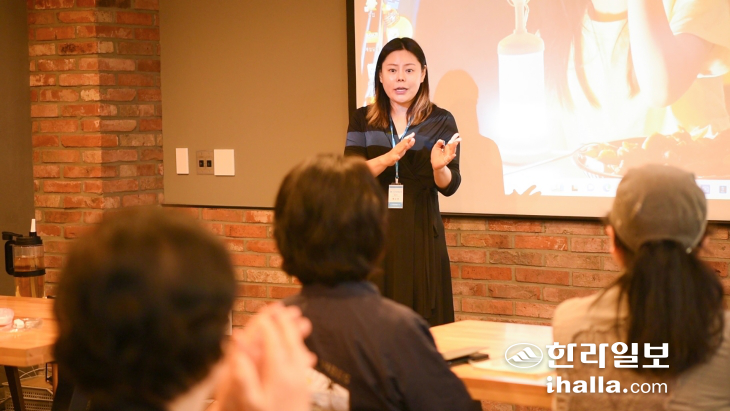 | 지난 13일 제주도근로자종합복지관 지하에 있는 '디지털배움터'에서 곽도연 강사가 교육하고 있다. 신비비안나 기자 |