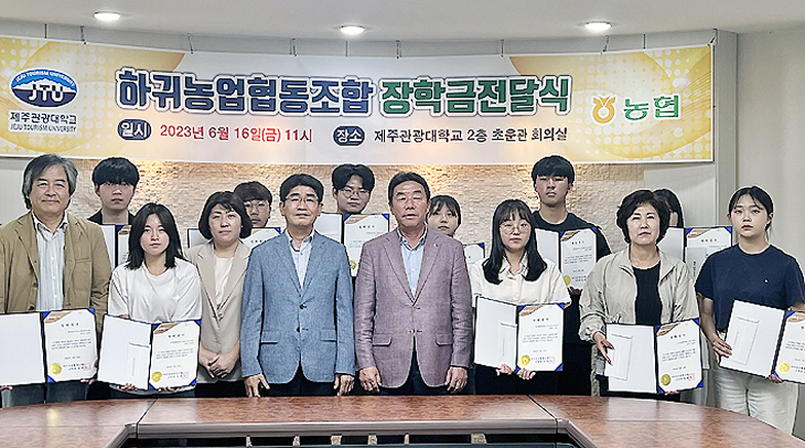 하귀농협(조합장 강병진)은 지난 16일 지역 발전의 밑거름이 될 훌륭한 인재 양성을 위해 제주관광대학교를 방문해 12명의 학생에게 각 50만원씩 총 600만원의 장학금을 전달했다.