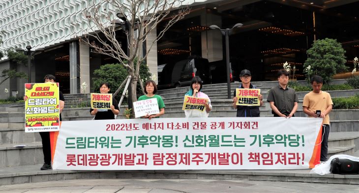[한라일보] 탈핵·기후위기 제주행동(이하 제주행동)은 20일 제주시 노형동 드림타워 앞에서 기자회견을 열고 "압도적 에너지 과소비·탄소배출 드림타워와 신화월드는 각성하라"며 "제주도는 에너지 다소비 건물에 대한 관리와 감독을 강화하라"고 요구했다.