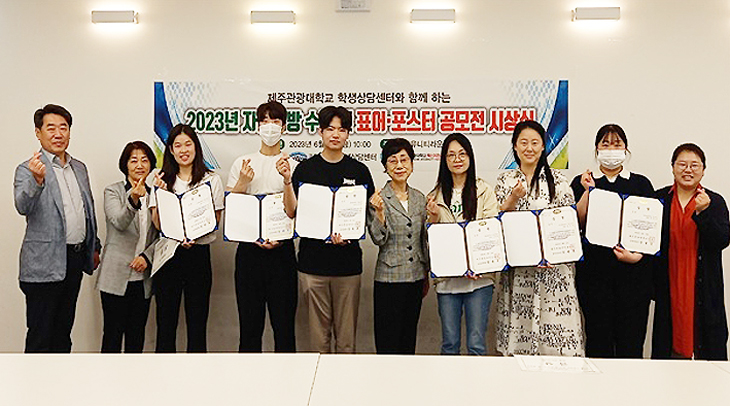 제주관광대학교(총장 김성규) 학생상담센터는 지난 16일 교내 커뮤니티 라운지에서 자살 예방 및 생명 사랑 의식 확산과 생명지킴이 활동 실천력 향상을 도모하기 위한 '2023년 자살 예방 공모전' 시상식을 개최했다.