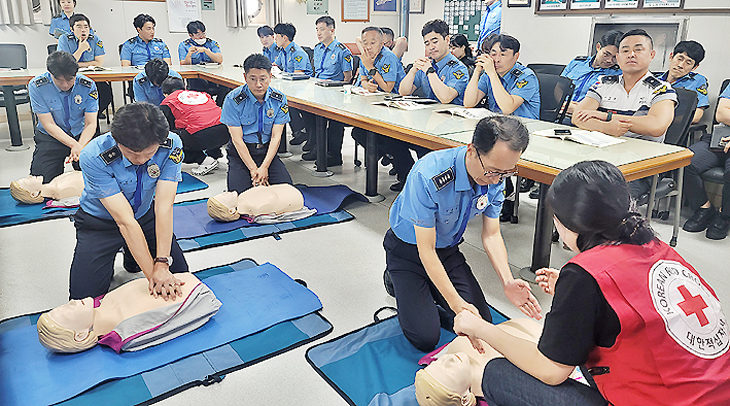제주해양경찰서(서장 소병용)는 20일 대한적십자사의 업무협조로 대형함정 3002함 회의실에서 응급처치 교육을 실시했다