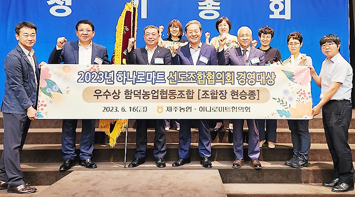 함덕농협(조합장 현승종)은 지난 16일 대전에서 열린 전국 하나로마트 선도조합협의회 정기총회에서 2022년도 하나로마트 경영대상 우수상을 수상했다고 밝혔다. 이번 경영 대상은 전국 농·축협 하나로마트를 대상으로 농·축산물 유통 실적과 2022년 매출 실적을 종합 평가 시상했는데, 함덕농협은 2021년도 매출액 200억원 달성에 이어 이번 수상의 영광을 안았다.