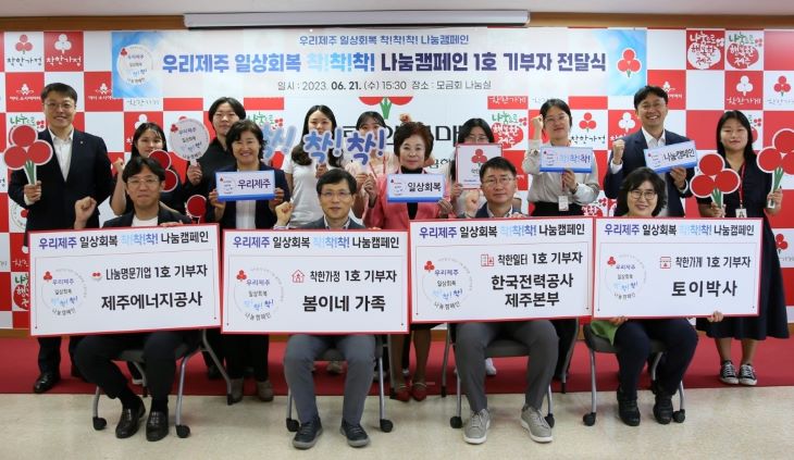 제주사회복지공동모금회는 지난 21일 캠페인 프로그램별 1호 기부자로 ▷나눔명문기업'제주에너지공사' ▷착한일터 한국전력공사 제주본부 ▷착한가게 '토이박사' ▷착한가정 '봄이네'가 참여해 성금을 전달하고 캠페인의 시작을 알렸다.