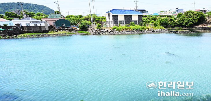 | 22일 찾은 제주시 구좌읍 김녕항 인근 바다. 원인미상 흰색 물질이 최초 발견된 지난 20일에 비해 탁도는 개선됐지만 여전히 희뿌옇다. 이상국 기자 |