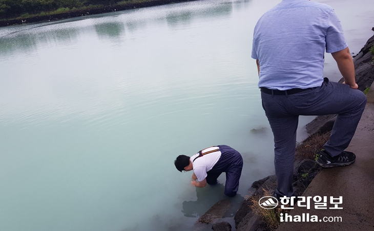 당시에는 탁도가 더 심했다고 한다. 조사 이틀째인 지난 20일 제주시가 찍은 사진을 보면 수심이 성인 무릎 높이에 불과할 만큼 얕은데도, 탁도가 워낙 심해 바닷속을 분간하기 힘들다.