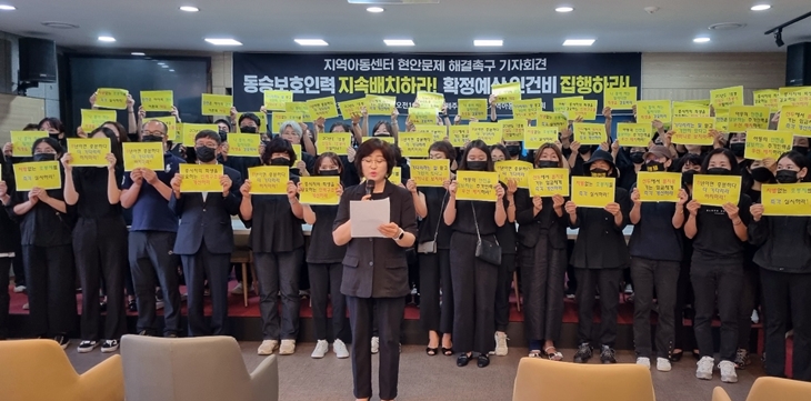 제주지역 64곳 지역아동센터로 구성된 (사)제주특별자치도지역아동센터연합회는 지난 23일 제주특별자치도의회 도민카페에서 기자회견을 열어 "예비비를 투입해서라도 동승 보호자 채용 예산을 지원하라"고 촉구했다.