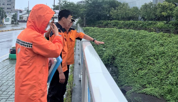 김수환 제주소방안전본부장과 관계자들이 25일 제주시의 주요 범람 우려 하천에 대한 현장 점검을 실시하고 있다. 제주소방본부 제공