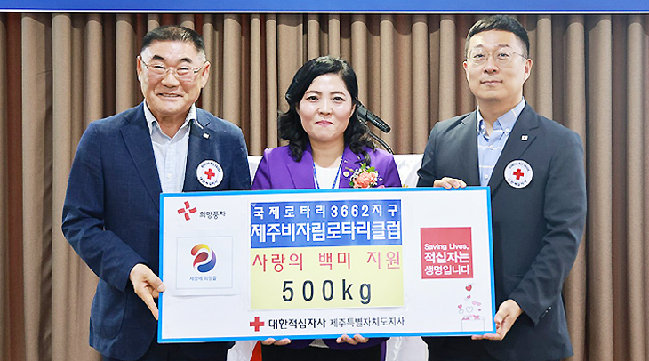 국제로타리3662지구 비자림로타리클럽 진금주 이임회장은 지난 22일 아젠토피오레컨벤션 연회장에서 진행된 회장 및 임원, 이사 이·취임식 행사에서 사랑의 쌀 500㎏을 제주사회복지공동모금회(회장 강지언)에 기탁했다.