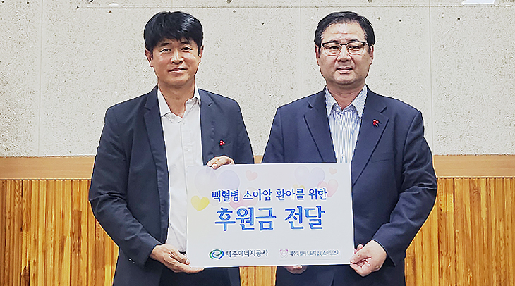 제주에너지공사는 지난 23일 소아암 및 희귀결핵질환을 앓고 있는 환우들의 치료비를 제주특별자치도백혈병소아암협회에 전달했다. 제주에너지공사는 2020년부터 현재까지'생명나눔'이라는 사회공헌 사업을 추진하며 제주도 내 소아중증질환 아동들에게 지속적으로 치료비를 지원하고 있다.