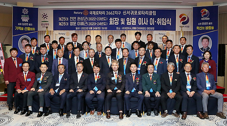 국제로타리3662지구 신서귀포로타리클럽은 지난 24일 서귀포칼호텔에서 제25대(회장 현상군) 및 제26대(회장 이해근) 회장에 대한 이·취임식을 개최했다.