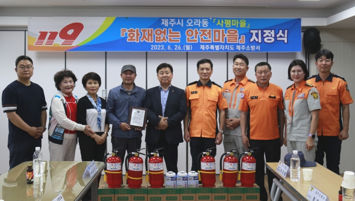 제주소방서는 지난 22일 해안마을을 시작으로 26일과 27일 양일간 제주시 사평마을과 영평상동마을에서 '2023년 화재 없는 안전마을' 지정식을 개최했다.