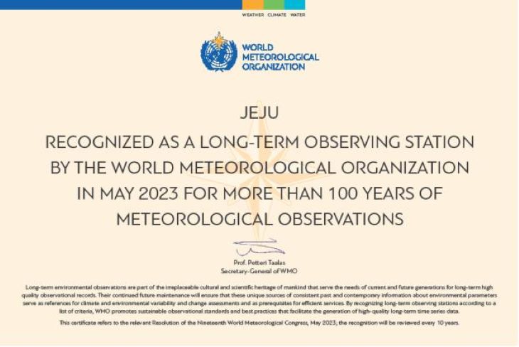제주지방기상청 세계기상기구 '100년 관측소' 선정
