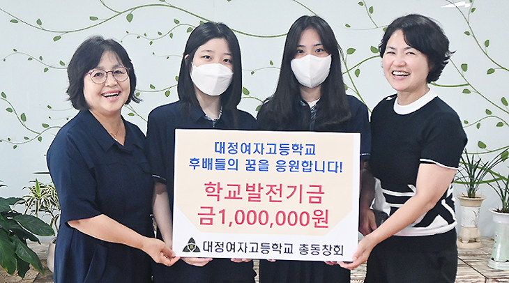 대정여자고등학교(교장 이영훈)는 지난 27일 비전홀에서 대정여자고등학교총동창회(회장 고형순)로부터 후배 사랑 장학금 100만원을 받았다.