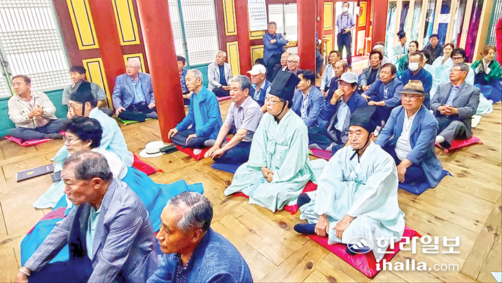 제주향교(전교 진인수)는 지난 2일 첫 삭망 분향례를 진행했다. 분향례에 앞서 수석부전교 강상청 외 18명에게 임명장을 수여하고 이어 헌관, 제관 20여 명이 대성전까지 향례를 마쳤다.
