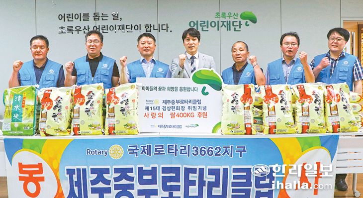 국제로타리 3662지구 제주중부로타리클럽(회장 김상헌)은 5일 초록우산 어린이재단 제주지역본부(본부장 변정근)에 사랑의 쌀 400㎏을 전달했다.