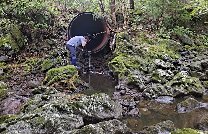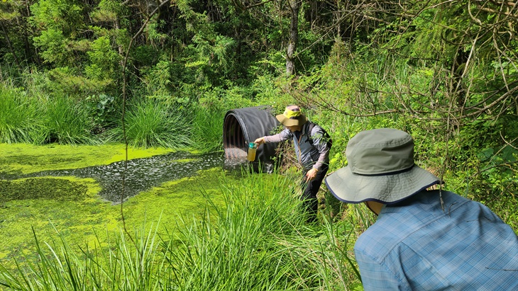 서귀포시 관계자가 지난 4일 안덕면 광평리 소재 한 골프장의 우수저류지에서 1500mm 대형 우수관을 통해 하천으로 흘러나오는 물의 냄새를 맡고 있다. 백금탁기자