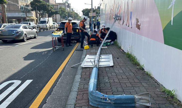 6일 경찰과 제주소방서 등에 따르면 이날 오전 7시40분쯤 제주시 이도이동 제주소방서 인근 교차로에서 30대 남성 A 씨가 몰던 SUV가 좌회전을 하다 가로등을 들이받았다.