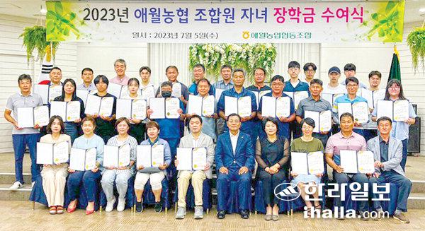 애월농협(조합장 김병수)은 지난 5일 대회의실에서 '2023년 애월농협 조합원 자녀장학금 수여식'을 갖고 조합원 자녀 35명에게 총 3500만원의 장학금을 전달했다. 애월농협은 조합원 자녀들이 미래 사회를 선도하는 창의적인 인재로 성장하도록 돕기 위해 2011년부터 장학금 지원사업을 시작해 올해까지 총 357명에게 3억2300만원을 지원했다.