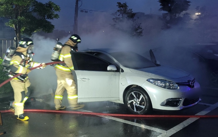 주차된 SM3 전기차 화재… 1시간 30여 분만 진화
