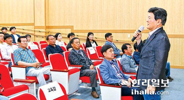 이날 김 교육감은 추자초, 추자중을 찾아 도서지역 학교의 어려움을 해소하기 위한 방안을 논의했고 횡간도 학교 부지 관리 실태를 점검했다. 또한 추자면 관계자 50여 명과 교육 현안 간담회를 열고 추자중 다목적 체육관 건립, 학교 교육 활동 강사 지원 방안 등에 대한 의견을 청취했다.