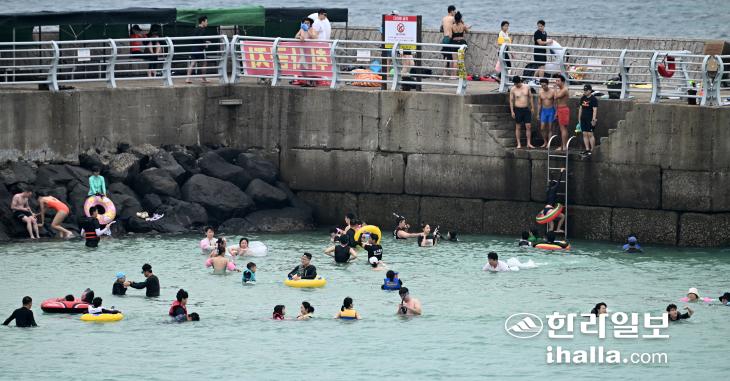 올해 첫 폭염특보가 발효된 10일 제주시 한경면 판포포구를 찾은 물놀이객들의 모습. 강희만기자